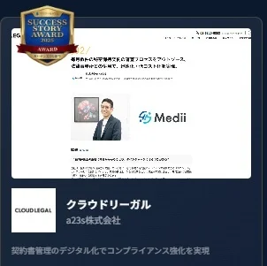 生成AI搭載のBPaaS:企業法務アウトソーシングサービスALSP(代替法務サービスプロバイダー)の国内パイオニアで、バーチャル法律事務所「クラウドリーガル」(URL:https://www.cloudlegal.ai/)を提供している、a23s株式会社(所在地:東京都中央区、代表取締役、弁護士「日本・米国NY州」 﨑地康文、以下a23s)は、この度『デジタル化の窓口』を運営する株式会社クリエイティブバンク(本社:東京都千代田区)が発表した「SUCCESS STORY AWARD 2025 byデジタル化の窓口」のガバナンスDX部門でクラウドリーガルの導入事例がAWARDに受賞したことをお知らせします。