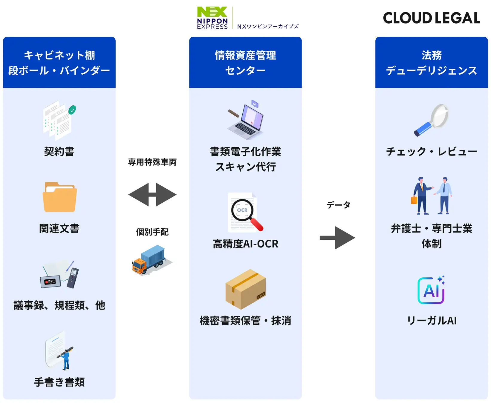 生成AI搭載のBPaaS:企業法務ALSP「クラウドリーガル」とNXワンビシアーカイブズの書類電子化サービス「WAN-Scan」・「AI-OCR×BPO」が法務デューデリジェンス分野で連携